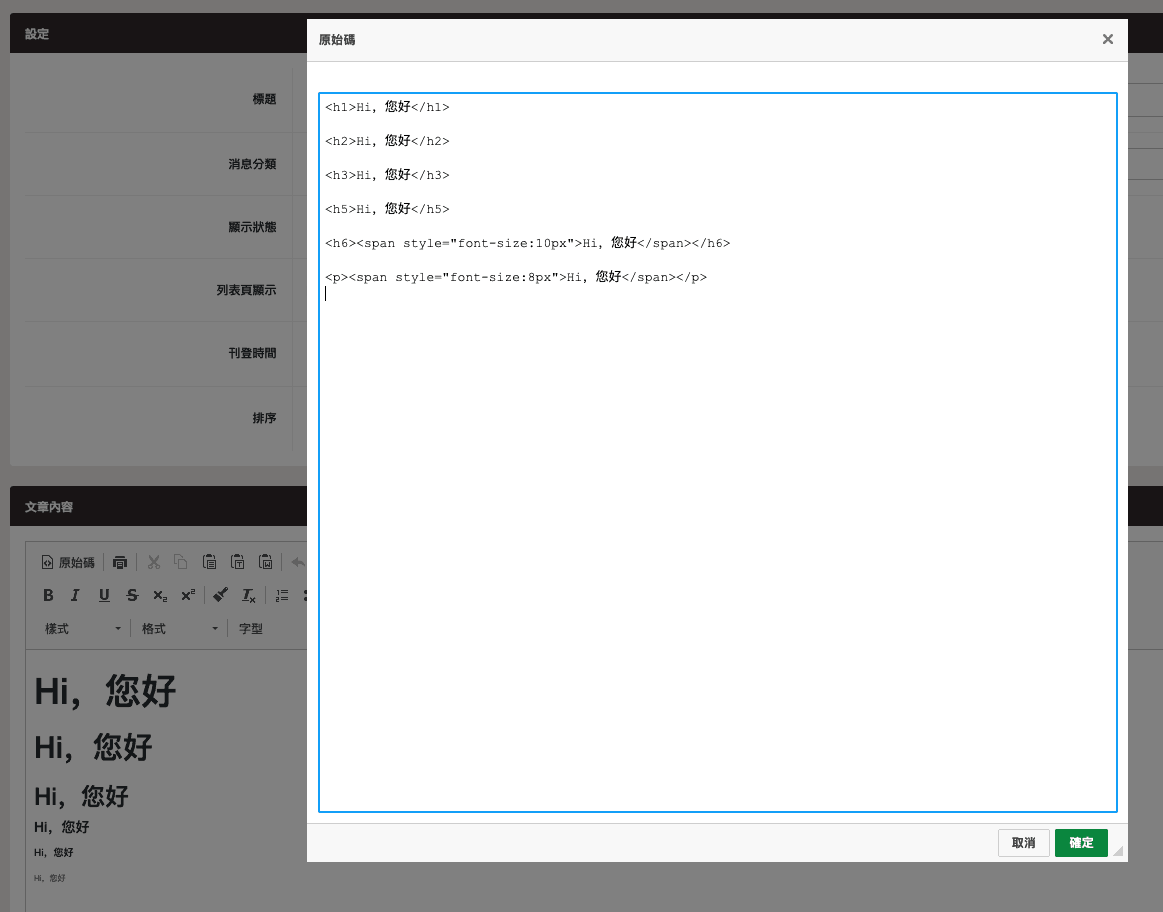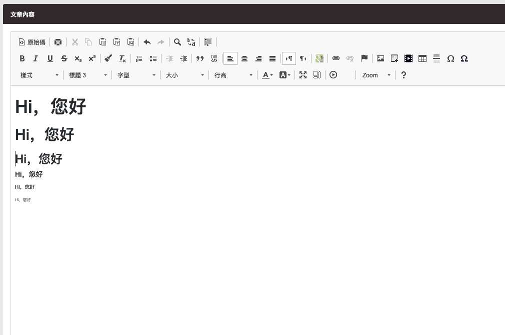 下方為後台樣式,使用了標題1234與字體大小.