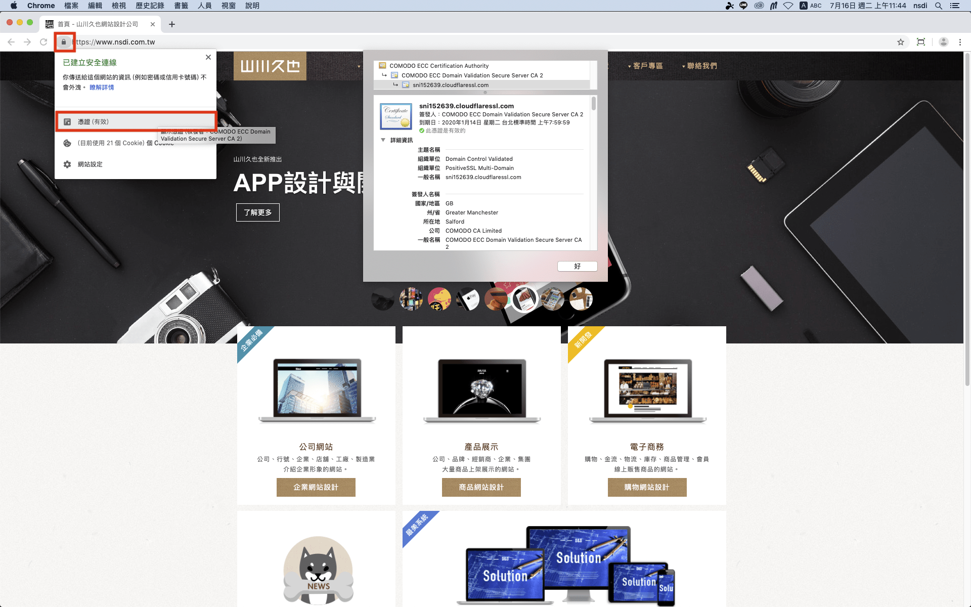 目前網站均建議採用SSL加密,主要增加使用者瀏覽網頁的安全性,用加密來保護傳送的資料,避免信用卡號或帳號密碼途中直接被竊取,SSL也會對Google搜尋排序有加分,對購物網站的消費者也會增加購物信心。若網站想增加SSL加密保護,請聯絡山川久也的客服或業務。