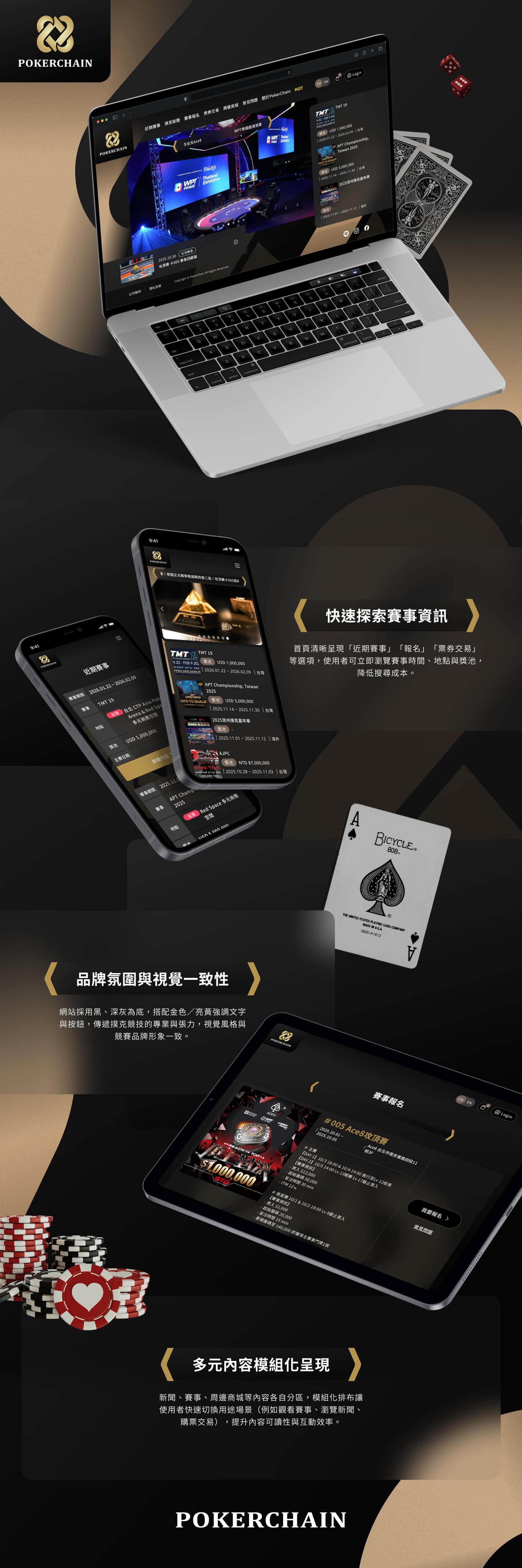 PokerChain 是一個串聯國內外撲克品牌與俱樂部的平台,致力於整合多方資源,打造專屬於撲克玩家的互動生態。網站以深色基調結合科技感線條,呈現競技與專業並存的品牌氣質。從賽事資訊到社群互動,設計以清晰導向與動態節奏為核心,帶來兼具娛樂性與專業度的數位體驗,展現撲克文化的無限可能。