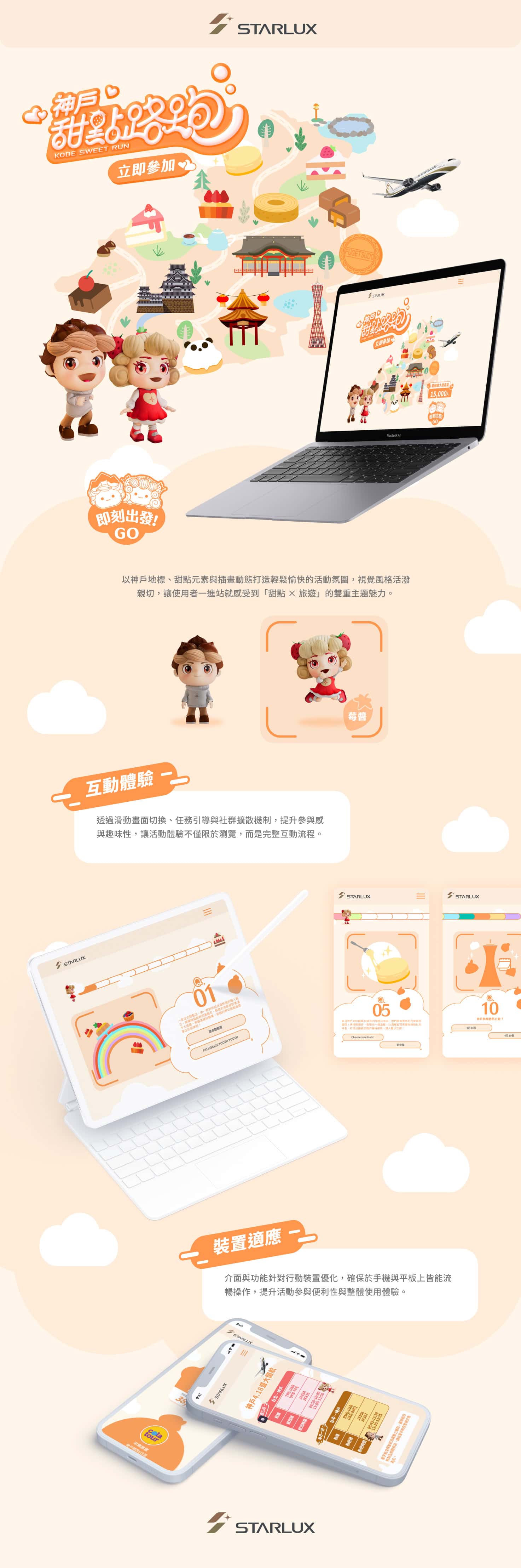 為慶祝星宇航空開啟台北-神戶新航線,本案結合當地甜點文化與路跑活動,打造主題式宣傳網站。設計上融合品牌視覺語言與清新活潑的甜點元素,運用模組化排版與滑動動畫,引導用戶輕鬆瀏覽活動資訊,營造趣味、參與感兼具的數位體驗。